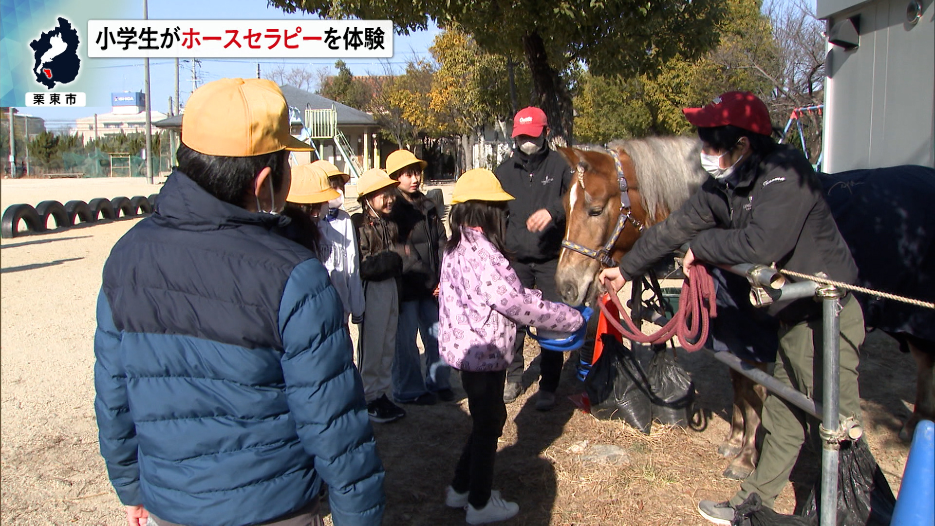 ホースセラピーを体験したのは、栗東市の治田西小学校の4年生です。この授業は、馬とのふれあいを通して馬の魅力やホースセラピーを学んでもらおうと、地域貢献活動に取り組む半導体製造装置メーカーの協力で初めて開かれました。