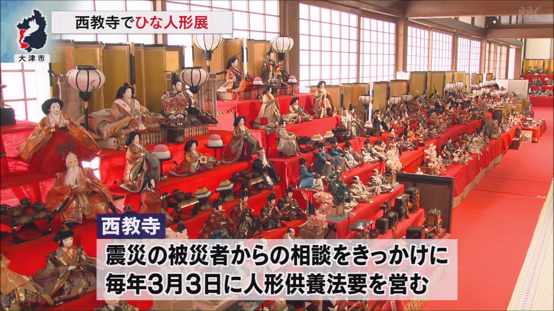 大津市坂本の西教寺では、阪神淡路大震災の被災者から、置き場所がなくなったひな人形の供養を相談されたことをきっかけに1999年から毎年、3月3日に全国から持ち寄られた人形を供養する法要が営まれています。
