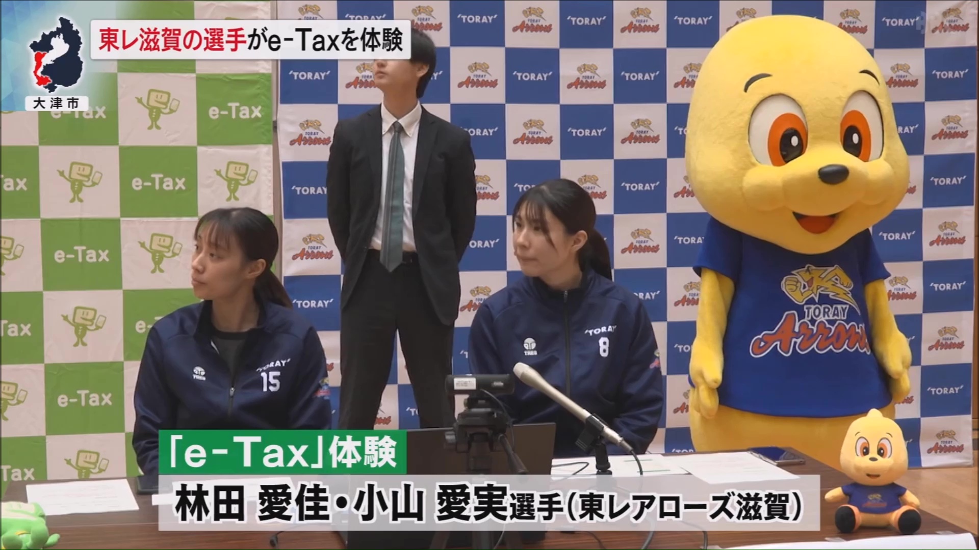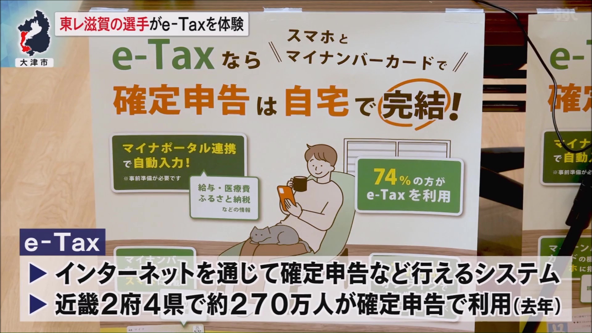 この日の模擬体験は、大津税務署が「e‐Tax」の利用を呼びかけようと行ったもので、両選手は、スマートフォンを使い、医療費やふるさと納税の還付の手続きを行いました。