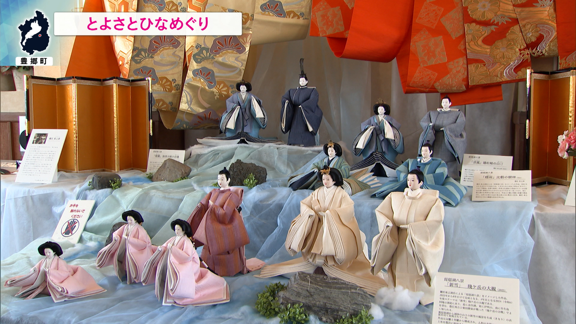 また滋賀県内の代表的な風景を選定した「琵琶湖八景」をイメージしたひな人形もあり、「『夕陽』瀬田石山の清流」では、赤色の帯を夕陽に見たてて清流をイメージしたひな壇に飾られています。