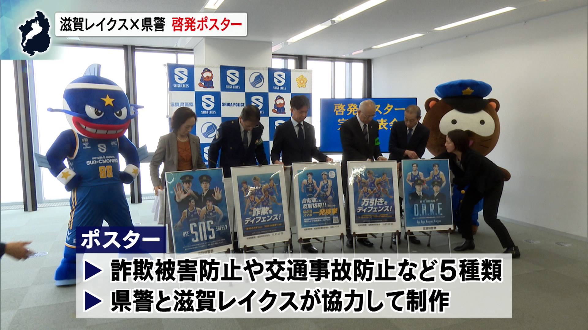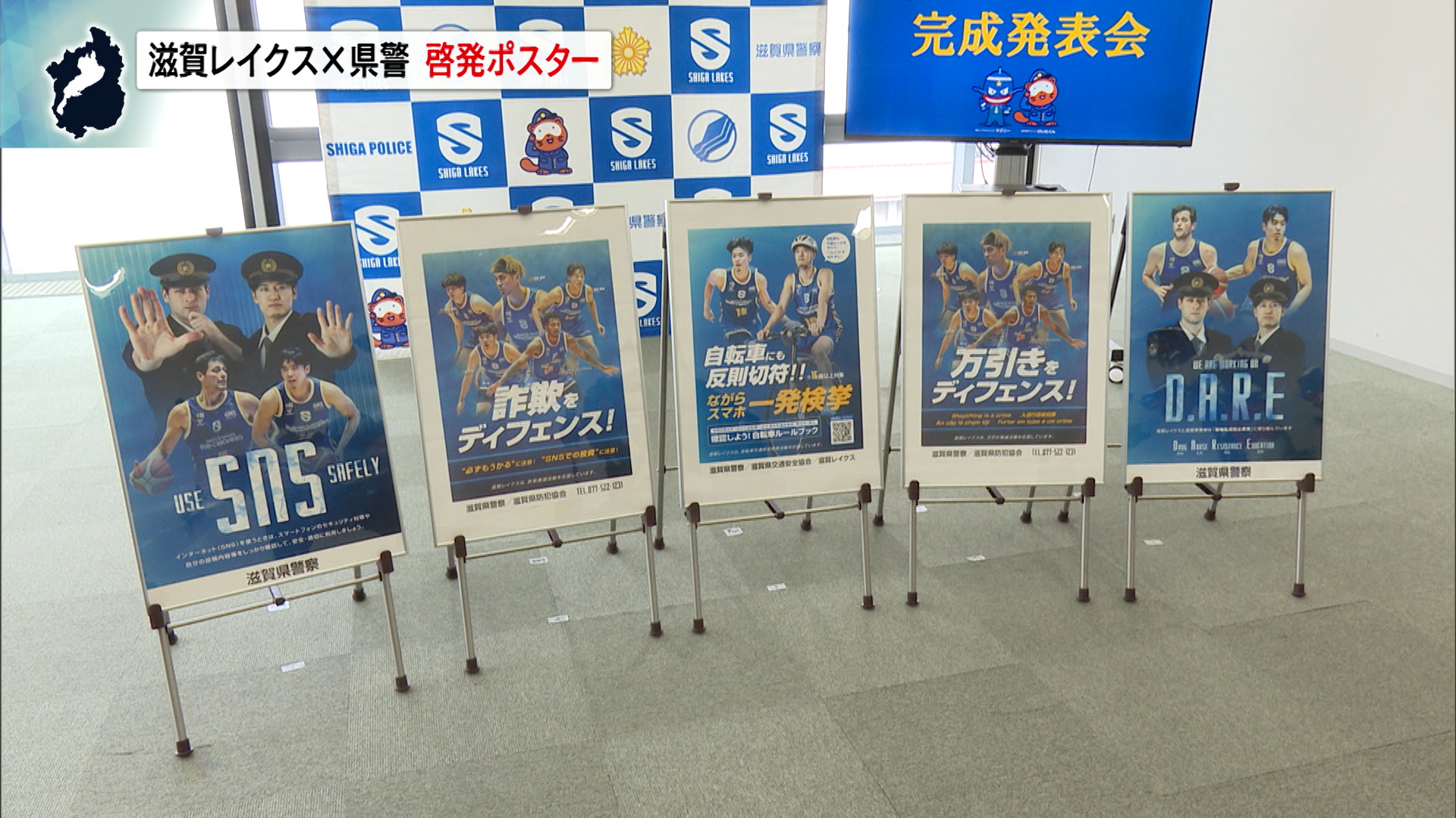 それぞれ、詐欺被害防止や交通事故防止薬物乱用防止などを呼びかけるもので、滋賀レイクスと県警が協力して制作しました。