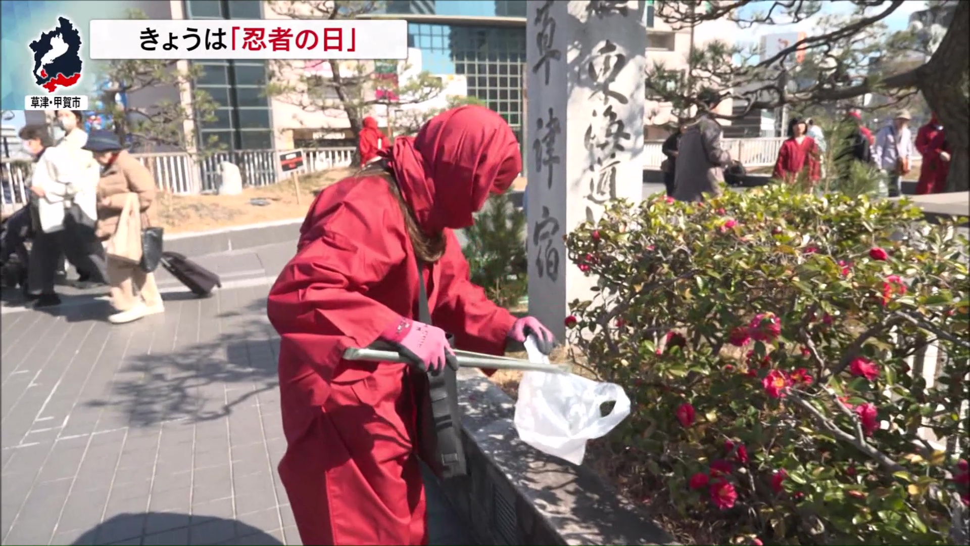 草津市の駅前では、大勢の忍者が集まり、周辺の清掃活動を行いました。