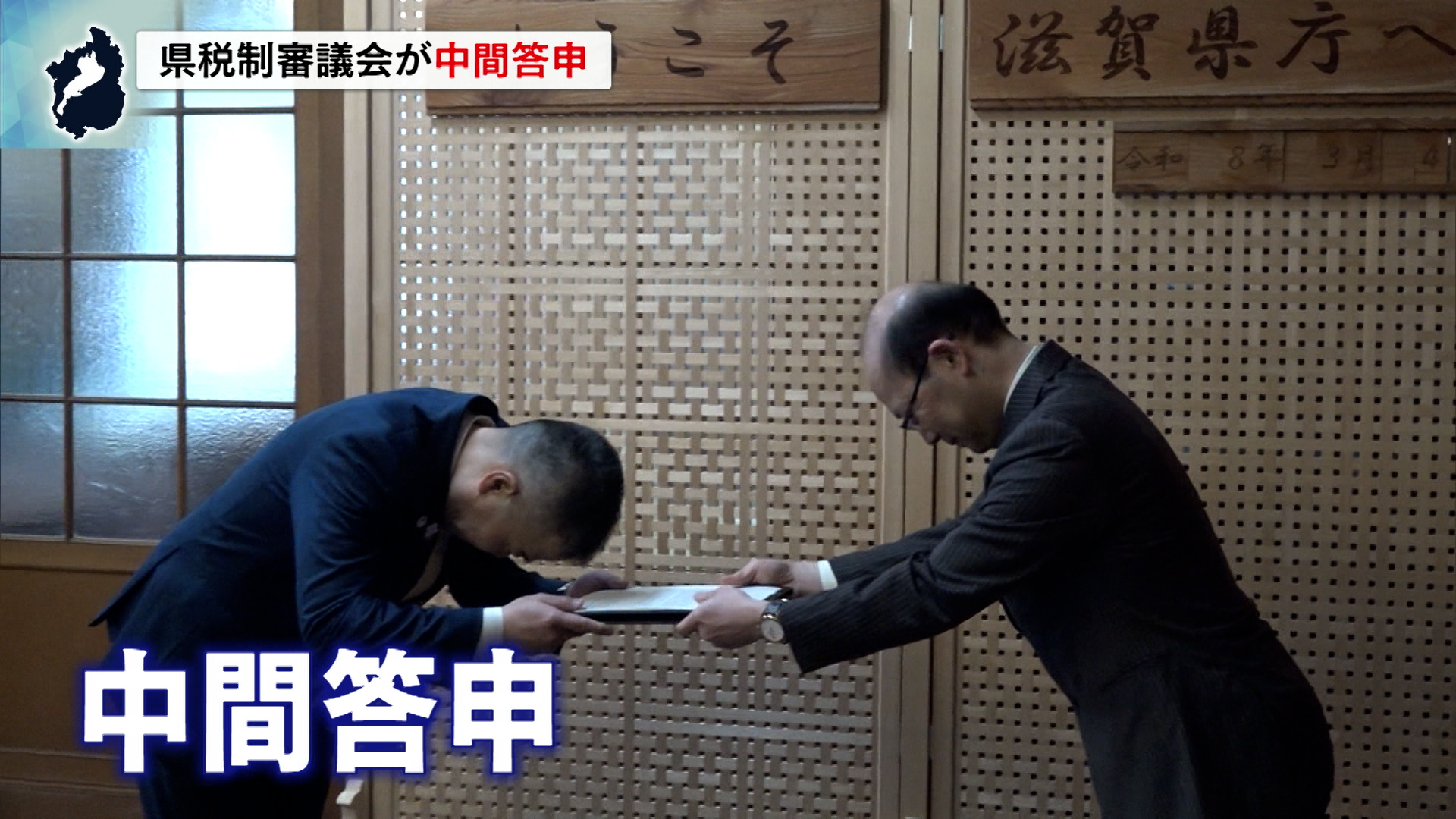 滋賀県庁では4日、県税制審議会の諸富徹会長から三日月知事に中間答申されました。