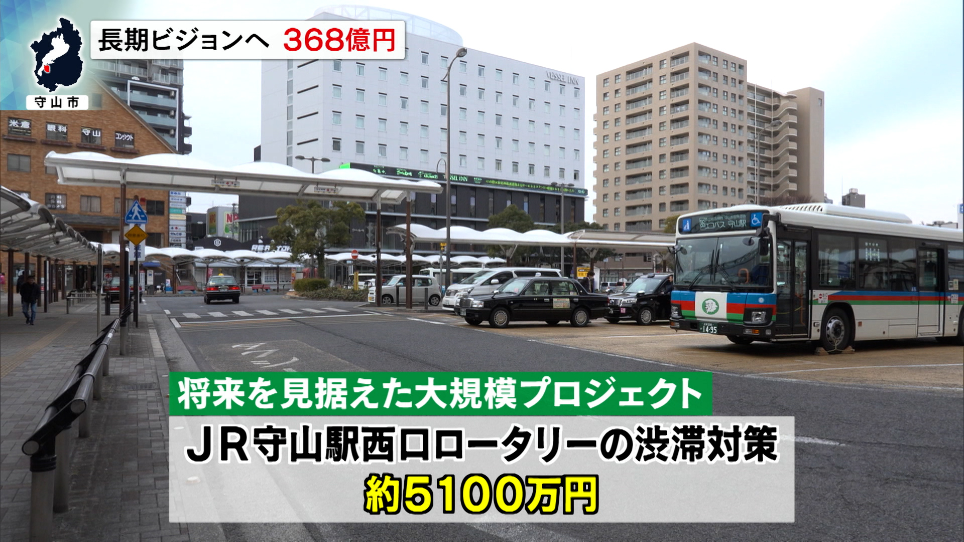 予算案では、攻めの事業となる「将来を見据えた大規模プロジェクト」の1つ、JR守山駅西口ロータリーの渋滞対策に約5100万円を計上しました。この事業では、ロータリー内の横断歩道の撤去や市営駐車場の形状を変え、駐車台数を現在の10台から16台にまで増やすなどして、西口周辺の渋滞緩和を図ります。