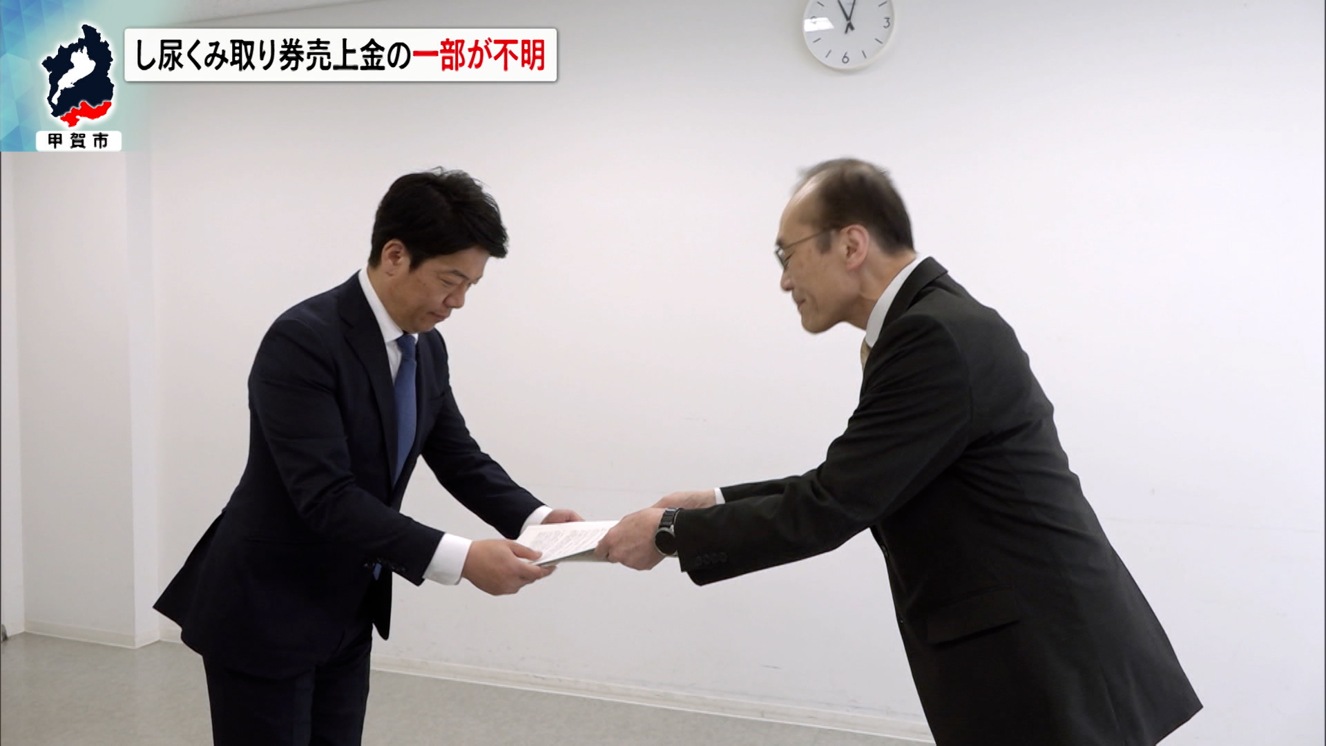 甲賀市のし尿くみ取り券の売上不足を検証してきた市の第三者調査委員会の答申は11日、甲賀市役所で行われ、委員会の真山達志委員長から岩永市長に調査結果が手渡されました。