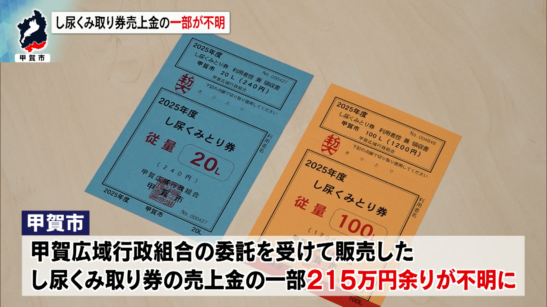 この問題は、甲賀広域行政組合の委託を受けて、市が販売したし尿くみ取り券の売上金のうち215万円余りの行方が分からなくなっているものです。