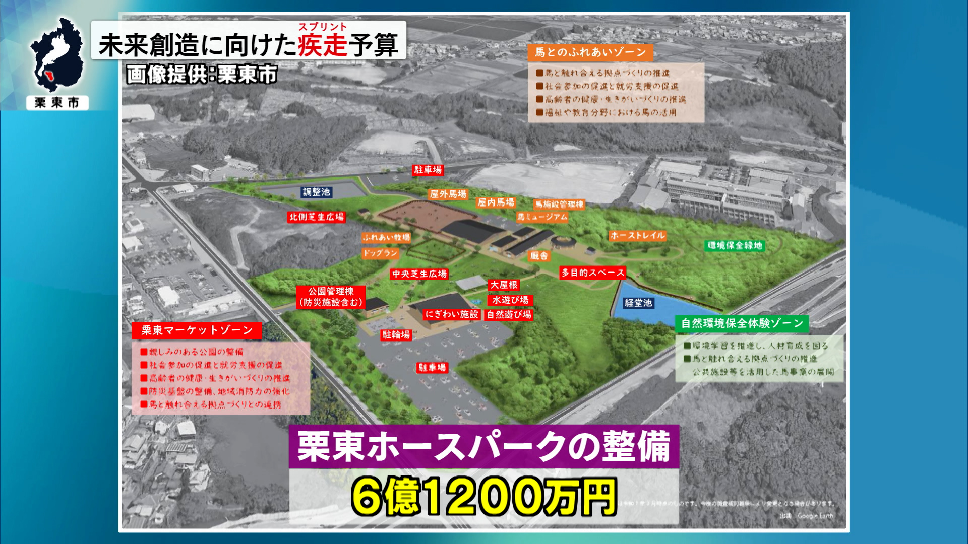 主な事業としては、2032年の全面開園を目指す「栗東ホースパーク」の整備費用として、新年度は詳細設計などに6億1200万円余りが、新たな産業拠点の形成に向けて整備が進められている東部六地蔵東西線の延線事業に10億8300万円余りが計上されています。