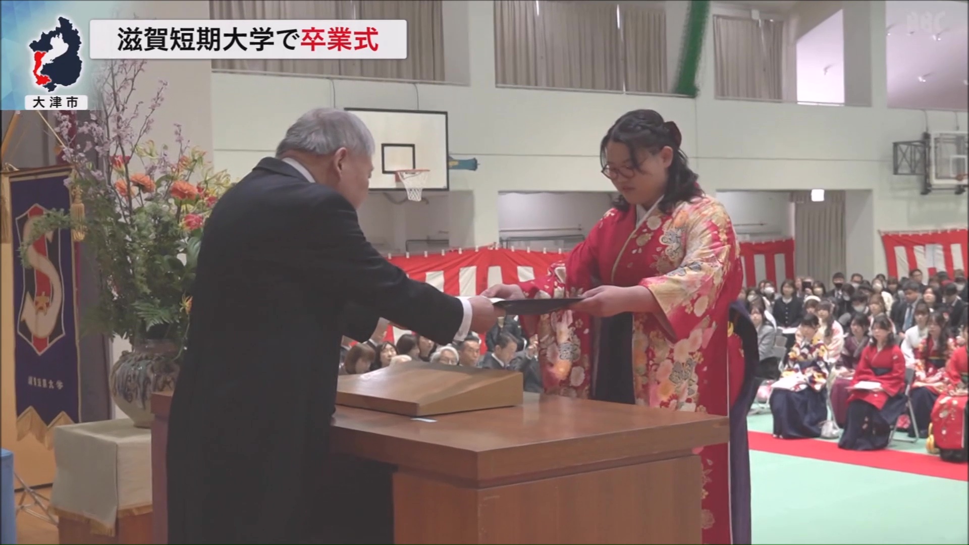 滋賀短期大学では今年度、生活学科・幼児教育保育学科・ビジネスコミュニケーション学科・デジタルライフビジネス学科、合わせて4つの学科の225人が卒業式を迎えました。式では、各学科の代表生が秋山元秀学長から卒業証書を受け取りました。