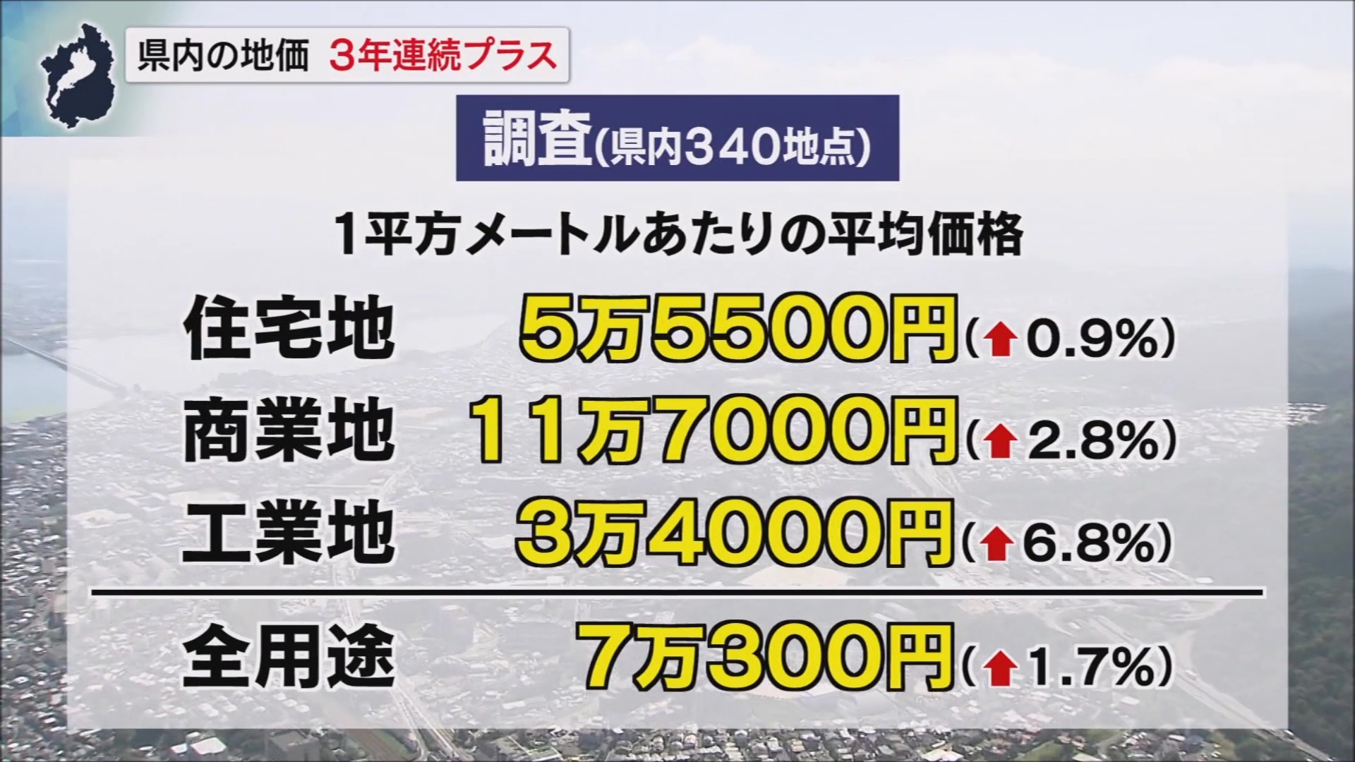 調査は、県内340の地点で用途別に行われました。それによりますと、県内の1平方メートルあたりの平均価格は、住宅地が5万5500円で変動率はプラス0.9%となりました。