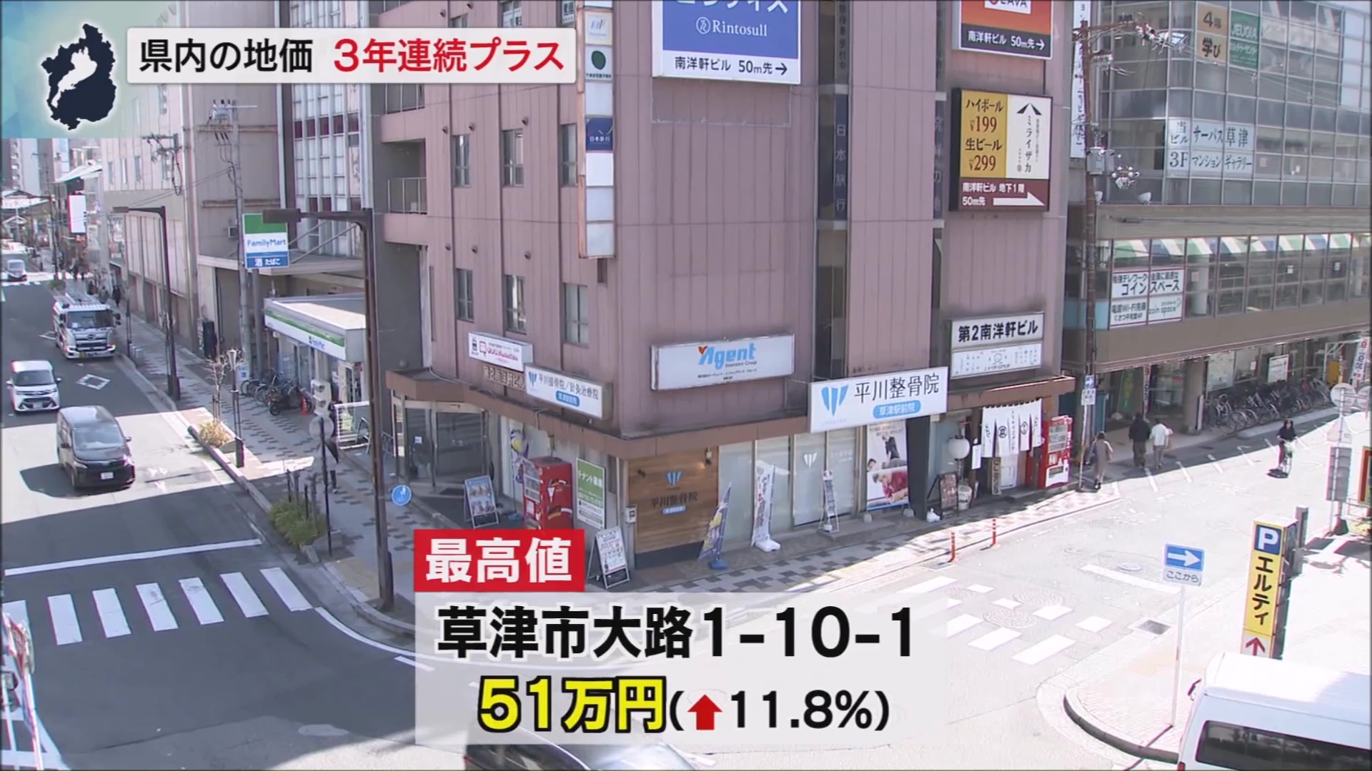 なお県内の商業地で地価が最も高かったのは、7年連続、JR草津駅前の草津市大路1‐10‐1で、去年より5万4000円上がった1平方メートルあたり51万円でした。