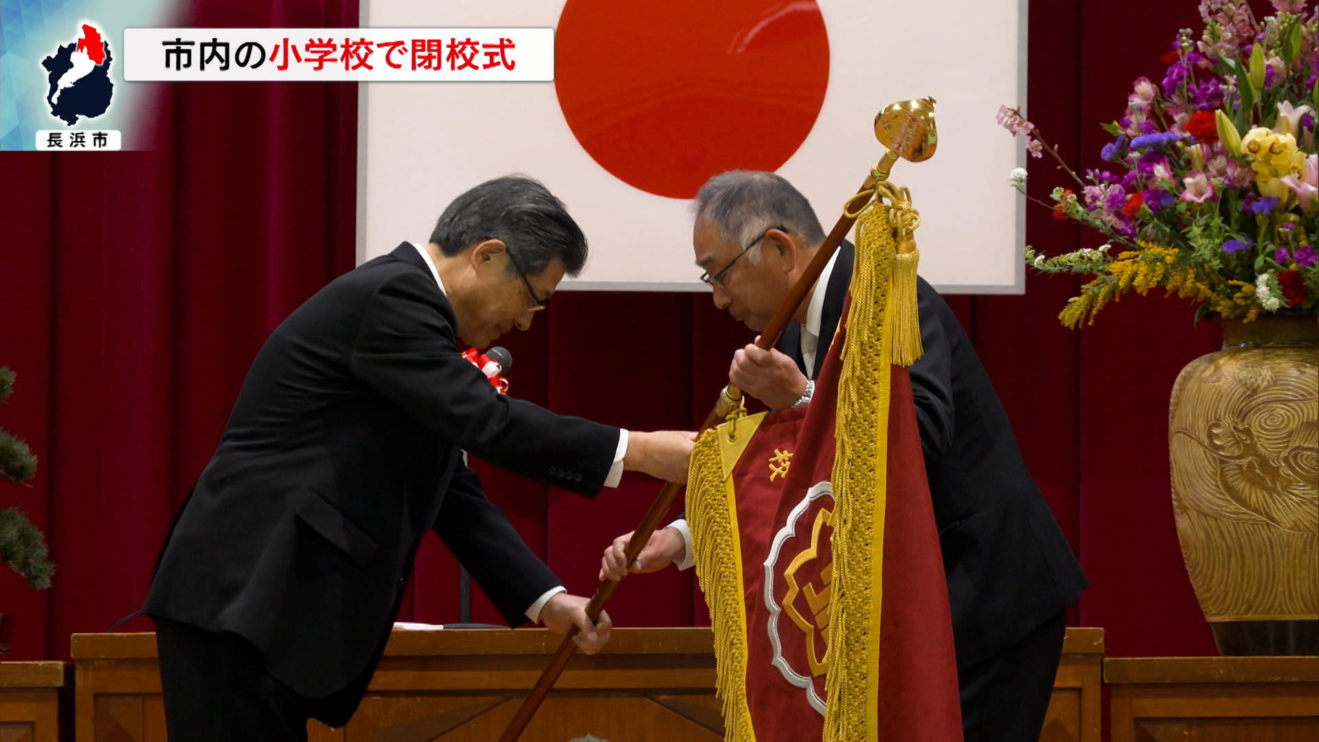 その後、中岡勝博校長から市教委の織田恭淳教育長に校旗返納が行われました。