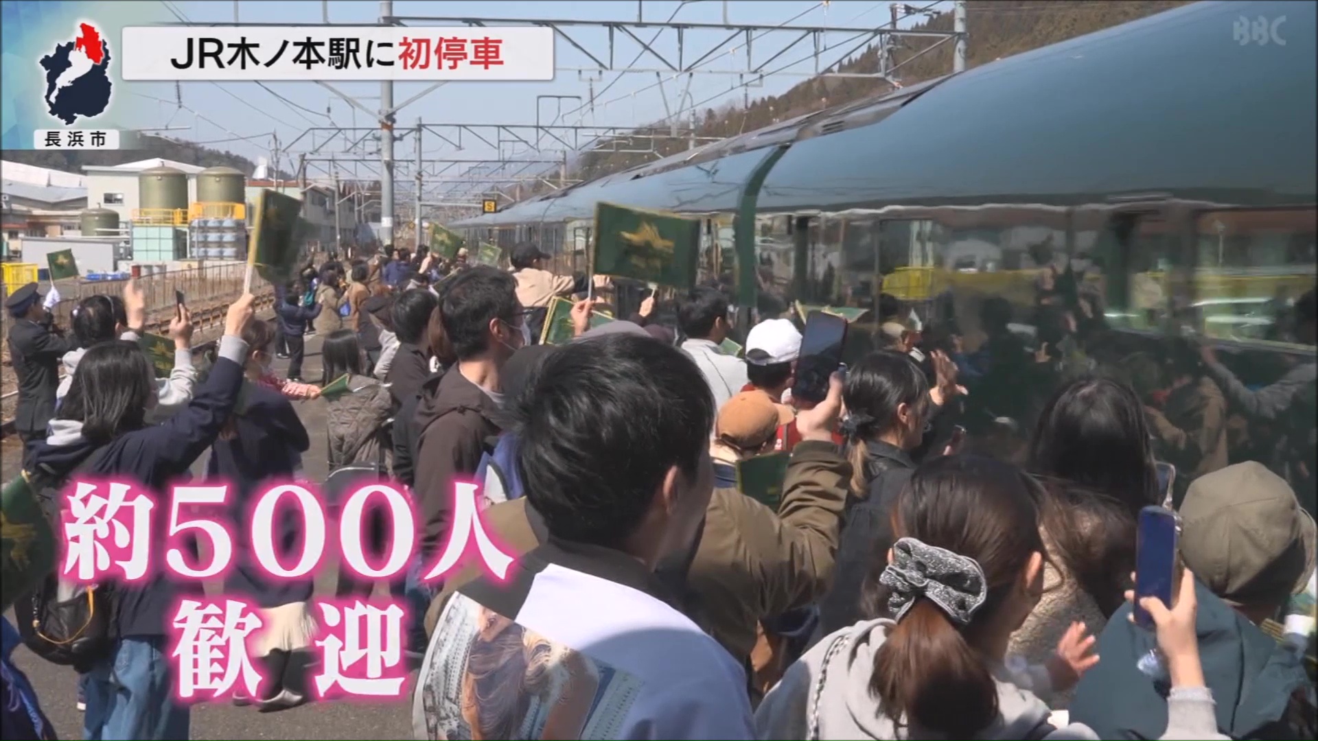 長浜市のJR木ノ本駅に到着したのはJR西日本の豪華寝台列車「トワイライトエクスプレス瑞風」です。1泊2日で京都府と山口県の下関を結び、今回から新たに途中で琵琶湖を一周する上りと下りの2つのコースを走ります。21日は京都駅を出発した下り列車が初めて停車し、長浜市の浅見市長をはじめ、地元の園児や住民など約500人が歓迎しました。