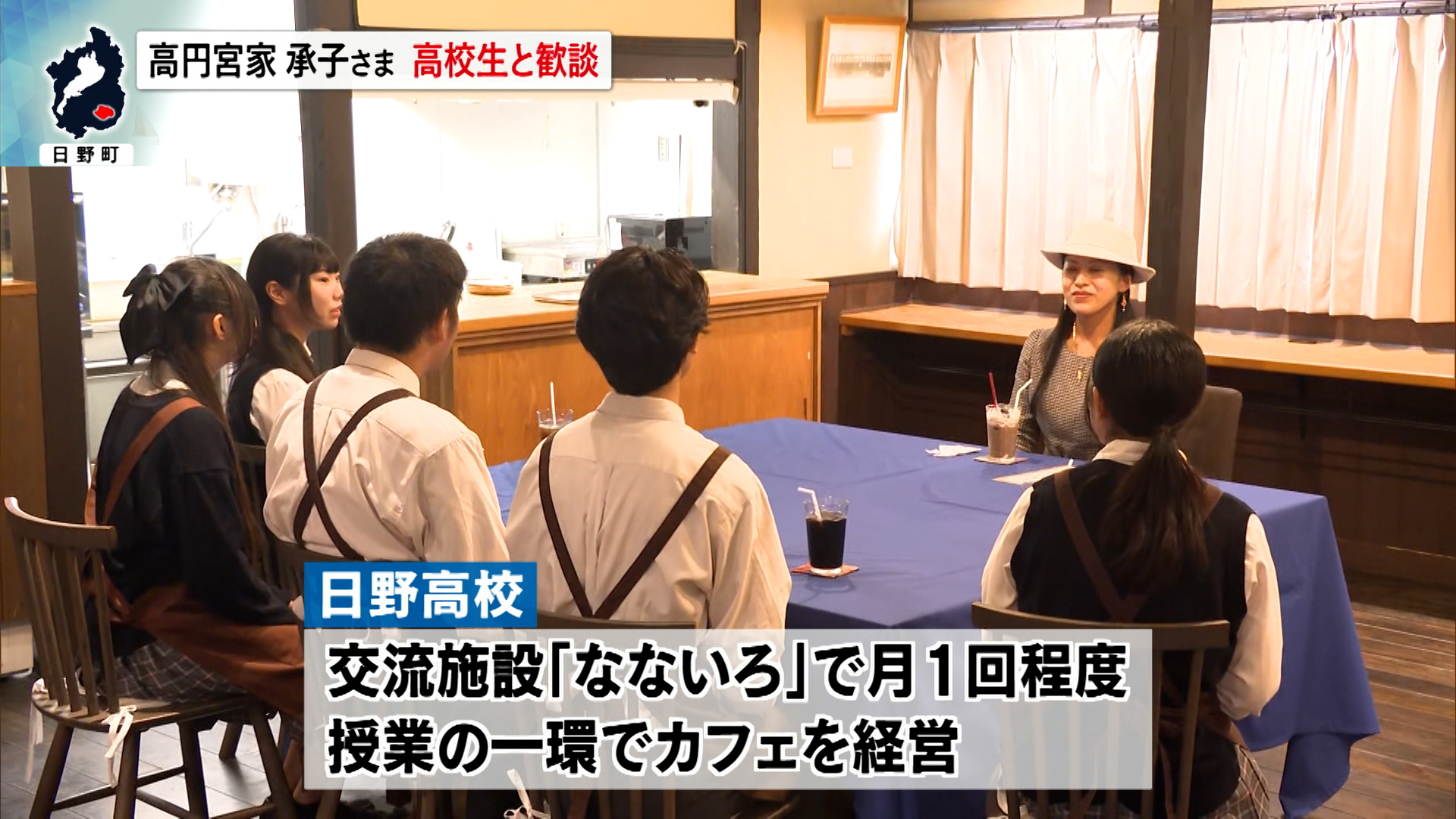 「なないろ」では、月1回程度、授業の一環でカフェを経営している地元・日野高校の生徒たちから、活動について紹介を受けた後、生徒が考案したオリジナルの飲み物を注文して、歓談されました。飲み物は、日野高校と連携している湖南市の三雲養護学校石部分教室の生徒が手作りしたコースターにのせて提供されました。承子さまは、カフェの営業について「役割分担はあるのですか」「ここで学んだことは何ですか」などと質問されたほか、部活動や将来の進路などについても会話が弾み、卓球をしていたという生徒に「私も卓球部だった」と笑顔で話していました。生徒らは「カフェに関係のない話、私自身の話なども聞いて下さったので、思ったより気さくな方で話しやすくて楽しかったです」「緊張しかなくて、でも、ちゃんと聞いてくれていて、町のことも知ってくれてうれしかった。丁寧で言葉一つひとつがきれいで、滅多にできない体験できたと思います」と話していました。