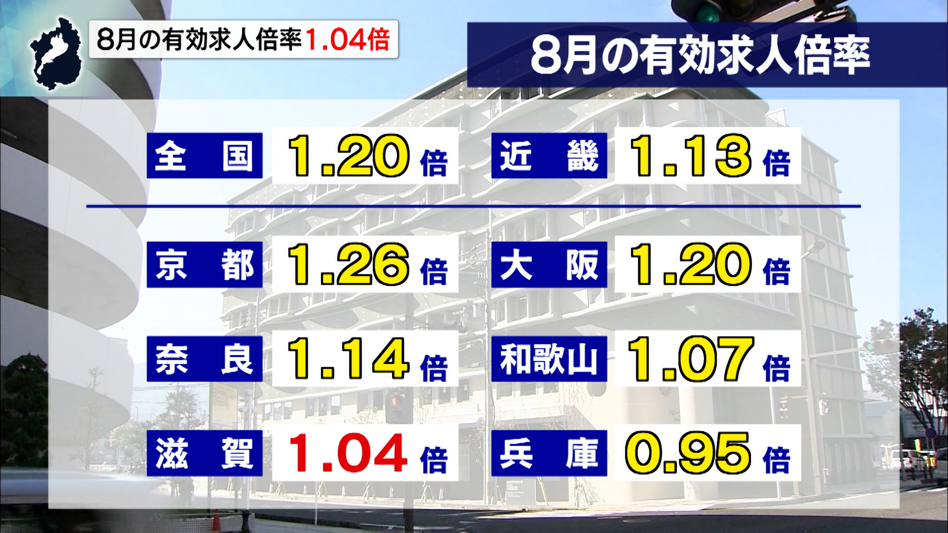 滋賀県の8月の有効求人倍率は、1.04倍と5カ月ぶりに低下したことがわかりました。