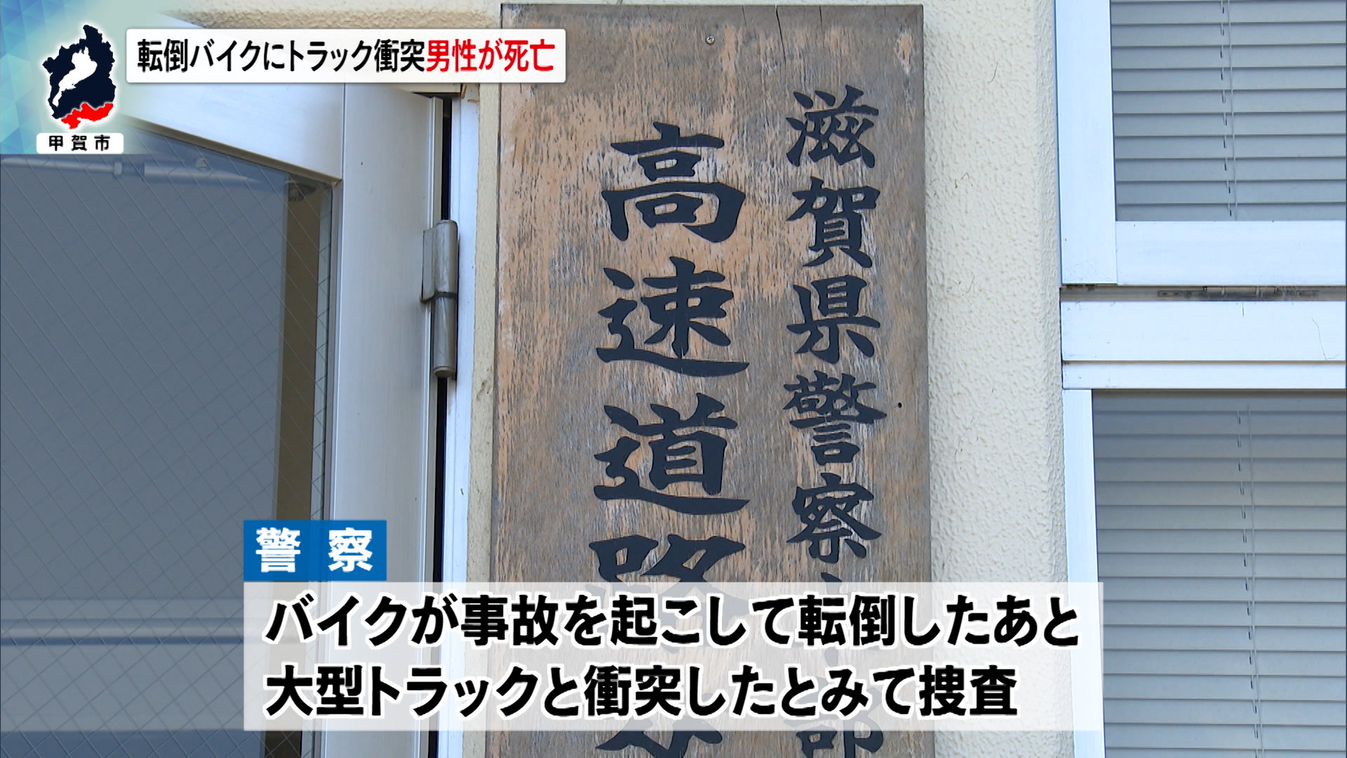 5日朝早く、甲賀市の新名神高速道路で、転倒していたバイクに大型トラックが衝突する事故がありました。バイクを運転していた男性は、その場で死亡が確認されました。5日午前4時半ごろ、甲賀市土山町の新名神高速道路上り線で、倒れていたバイクとバイクを運転していた男性に、大型トラックが衝突しました。バイクを運転していたのは、京都市伏見区の会社員の榊原慎悟さん(45)で、その場で死亡が確認されました。現場近くの側壁には、バイクがぶつかったような跡があり、警察では、バイクが事故を起こして転倒したあと、大型トラックと衝突したとみています。