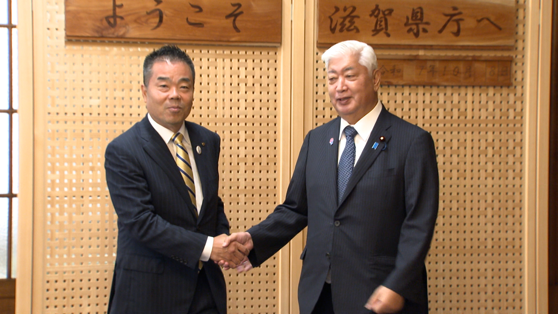 今年2月、高島市の陸上自衛隊饗庭野演習場で、榴弾砲の訓練中に砲弾1発の弾着が不明となった問題で、中谷防衛大臣が8日、滋賀県庁を訪れ三日月知事と面会し、謝罪と再発防止の徹底を伝えました。